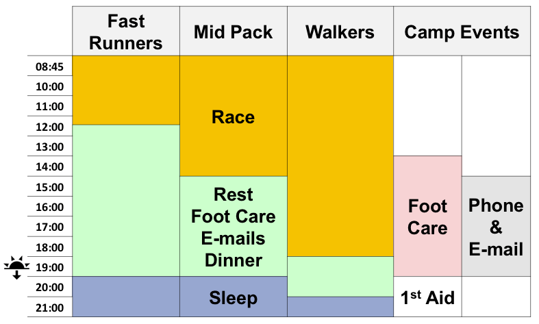 Indicative race day time table by competitor type. Stage starts ar typically earlier than the chart indicates.