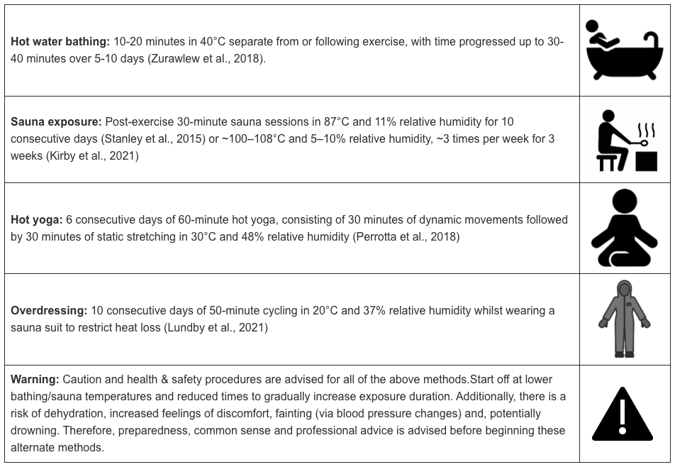 Fortunately, sauna exposure and hot water bathing can be separate from training. You can undertake this post-exercise when you’ve already increased physiological strain, and this may help with efficiency and effectiveness. Further information can be found in the table below: