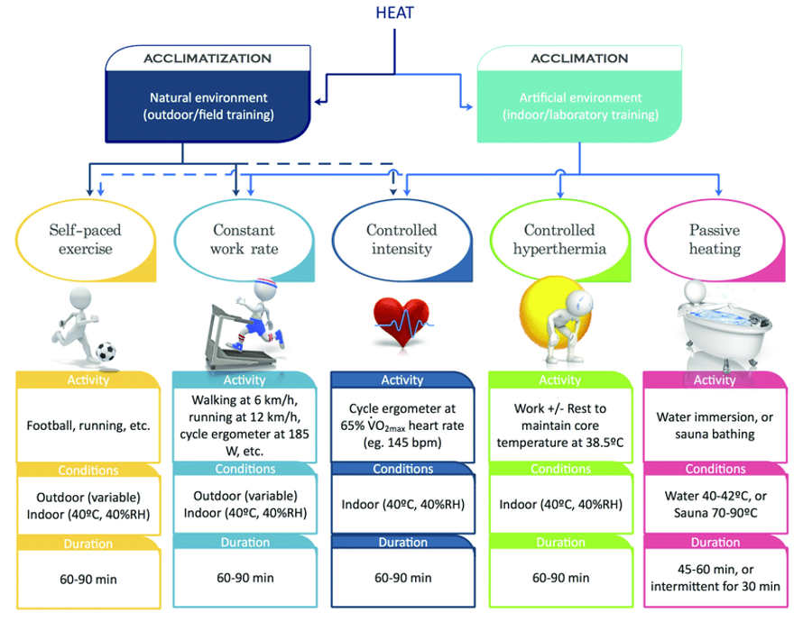 There are numerous methods used to adapt to heat stress. They include cycling sessions in a heat chamber, running in heat outside in hot natural conditions, or undertaking post-exercise sauna exposures and hot water bathing. All of these have their positives and negatives. However, the sections below will attempt to cover as many “hot topic” questions as possible and provide you with evidence-based practice. A summary of the typically used heat acclimation methods can be seen in the figure below (Racinais et al., 2019).