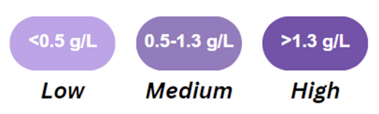 Figure 2. Sodium losses range from low (<0.5 g/L), medium (0.5-1.3 g/L) to high (>1.3 g/L).