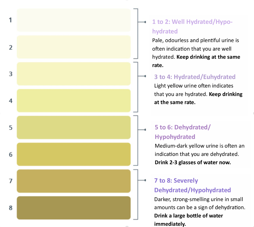 There are two methods to assess your hydration status; 1) a simpler method including a urine colour chart (Figure 4), and 2) analysing a urine sample with specialist, yet reasonably cheap equipment (Table 1). Both methods determine whether you hydrated or not, and the severity of dehydration. The most cost-effective (~£25) and reliable method out of the two is analysing your urine sample using a refractometer. This is because the colour of your urine can be influenced by certain foods, medications and vitamin supplements, and maybe somewhat subjective.